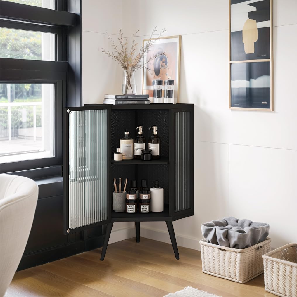 Amazon Wetiny Modern Corner Storage Cabinet with Tempered Glass Doors Accent Corner Hutch Cabinet Freestanding Metal Corner Table Shelf for Very well made.