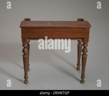 Wooden writing desk with four fluted legs. At the front below the mid section on either side are long rectangles of wood with angled triangles extending out from center. The desk has four cubby holes ... Very well made.