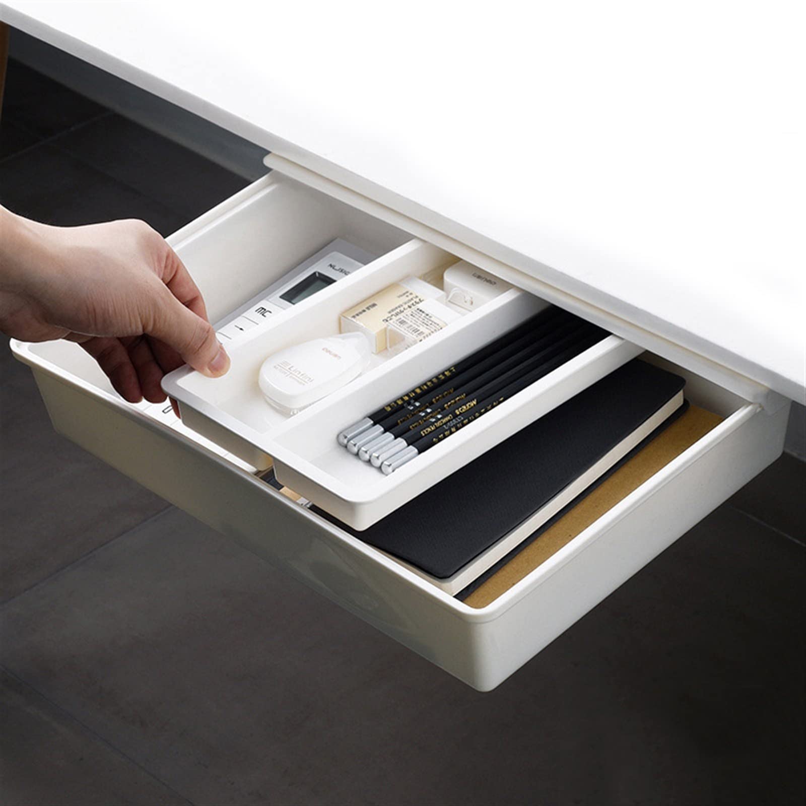 OSPNIEEK Self adhesive Under Desk Drawer Organizer 2 Pack Table Hidden Slide Out Large Storage Mounted Desktop Pencil Holder Tray Drawers For Office Very well made.
