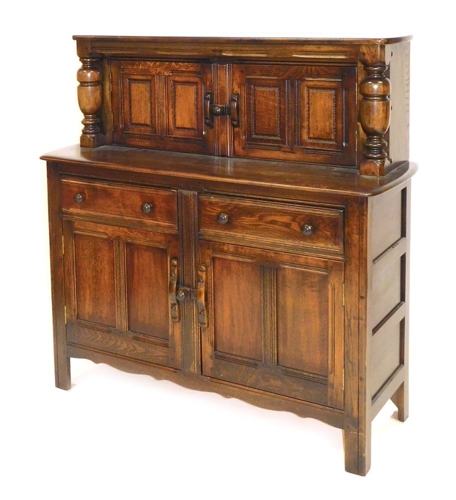 An Ercol dark oak court cupboard style sideboard with drawers and cupboards 4 wide Very well made.
