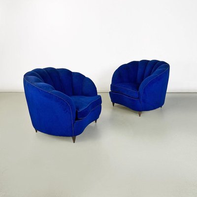 Italian Shell Armchairs in Electric Blue Fabric and Wooden Legs 1950s Set of 2 Very well made.
