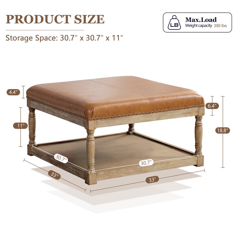 HUIMO Large Square Upholstered Button Tufted Ottoman Coffee Table Large Faux Leather Storage Ottoman with Shelf Solid Wood Legs Farmhouse Footrest Very well made.