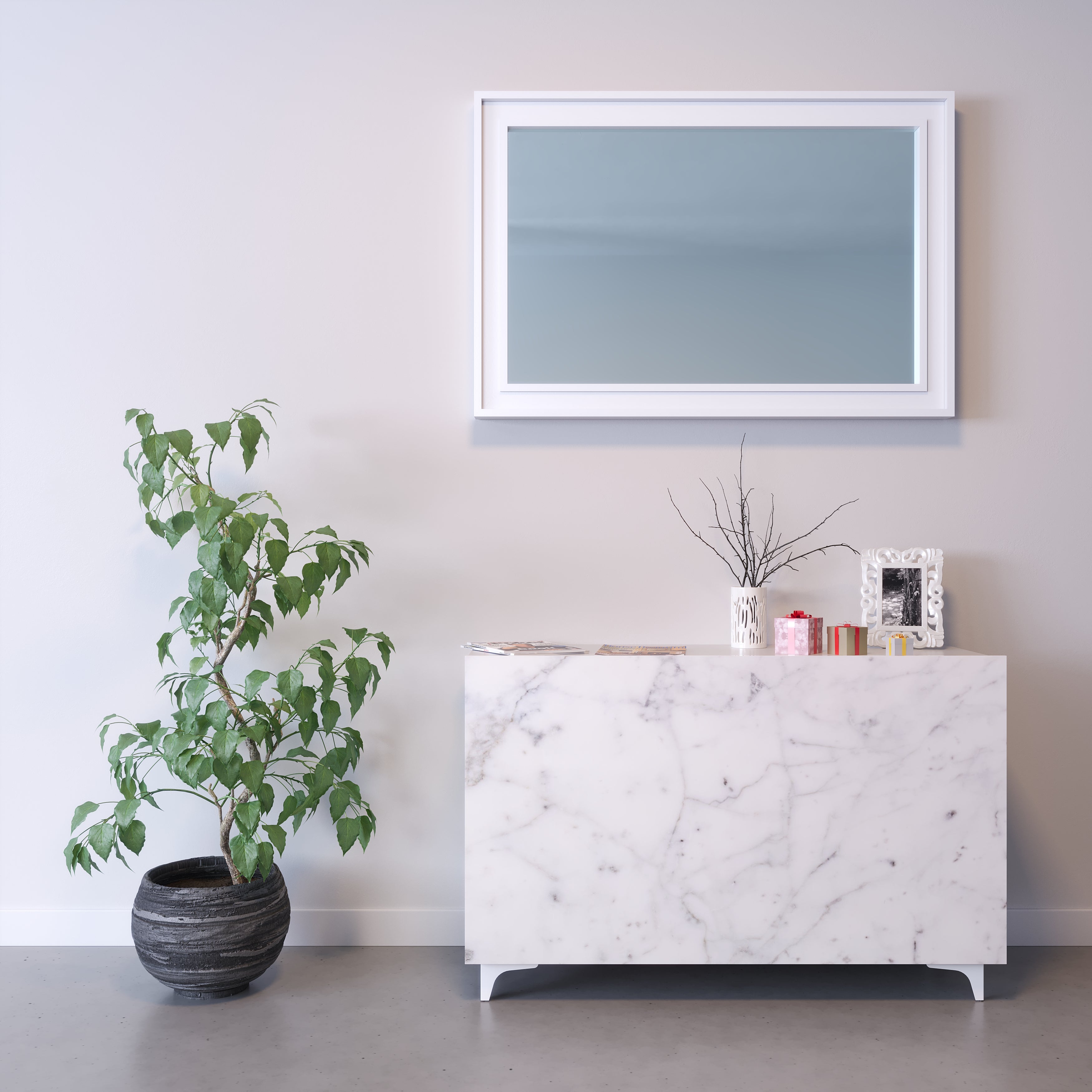 Lacquered Wooden Sideboard with Marble Effect and Mirror Very well made.