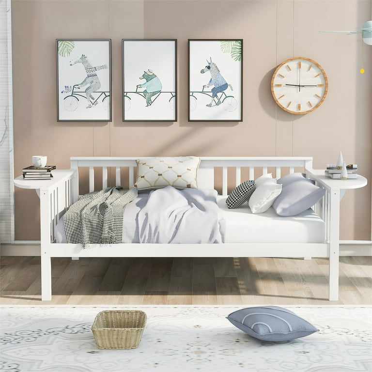 Full Size Daybed with 2 Side Small Folding Tables Wooden Sofa Bed Frame with Three Sides Guardrails Dual use Daybed Suitable for Bedroom and Living Room No Box Spring Required White Walmart Very well made.