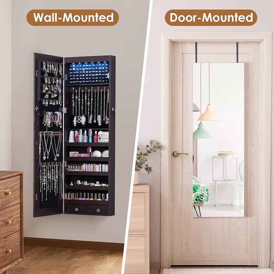 Amazon AOOU 6 LED Mirror Jewelry Cabinet Full Screen Display jewelry Armoire Organizer 47.3 H Lockable Wall Door Mounted Makeup Box with 2 Drawers Brown Clothing Shoes Jewelry Very well made.