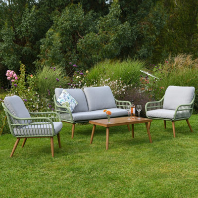 Aluminium Garden Sofa Armchairs and Coffee Table Furniture Luxury 4 Piece Set in Sage Green with Cushions Very well made.