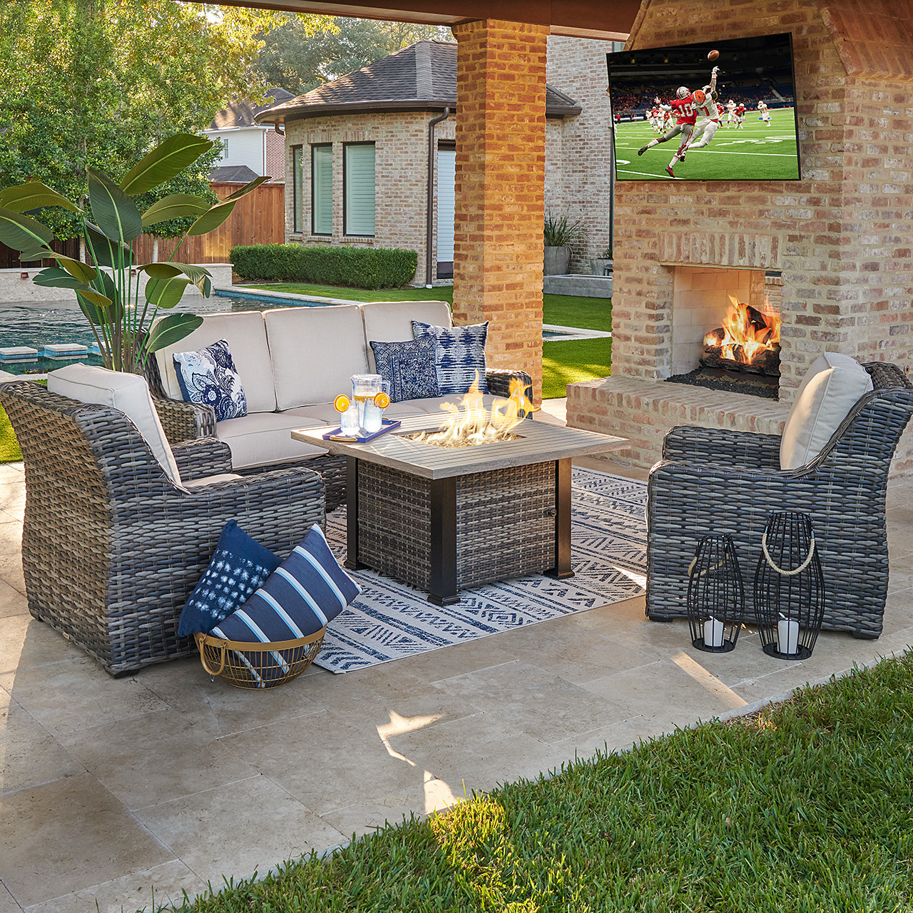 Tangiers Canola Seed Outdoor Wicker with Cushions 4 Piece Sofa Group 42 in. Sq. Fire Pit Coffee Table Very well made.