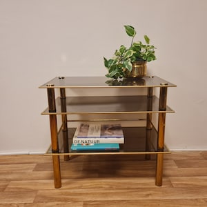 Vintage Hollywood Regency Gold Brass Mcm Table Or Tv Stand With Tempered Glass 80s Vinterior Very well made.