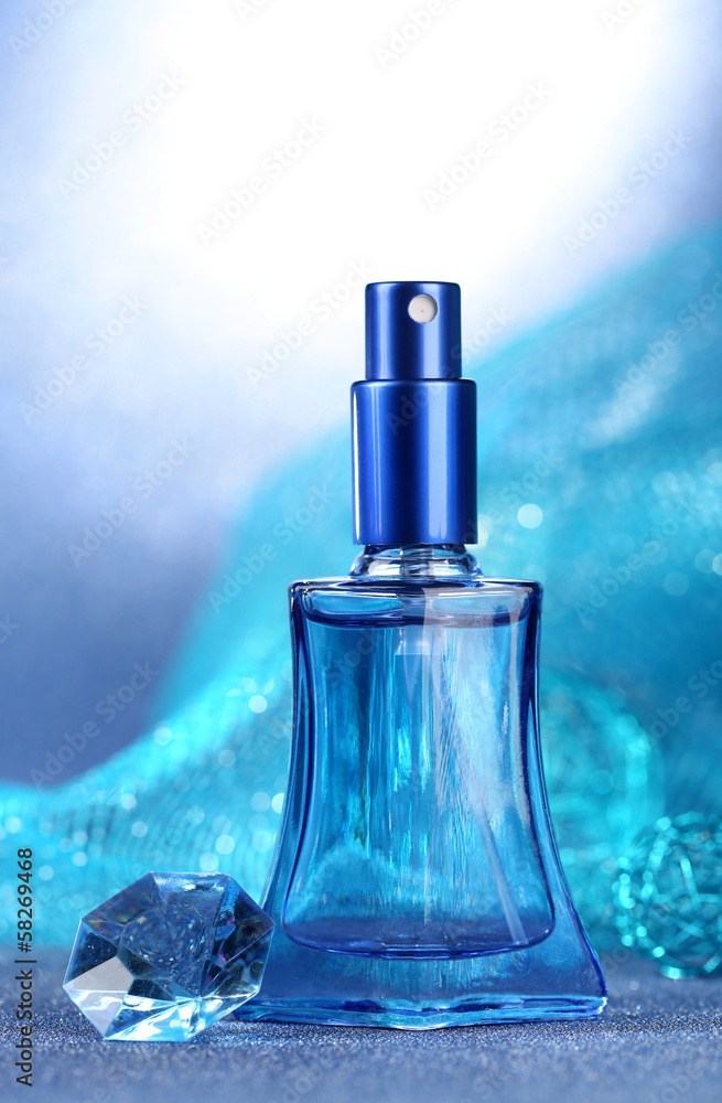 Women perfume in beautiful bottle on blue background Stock Photo Very well made.