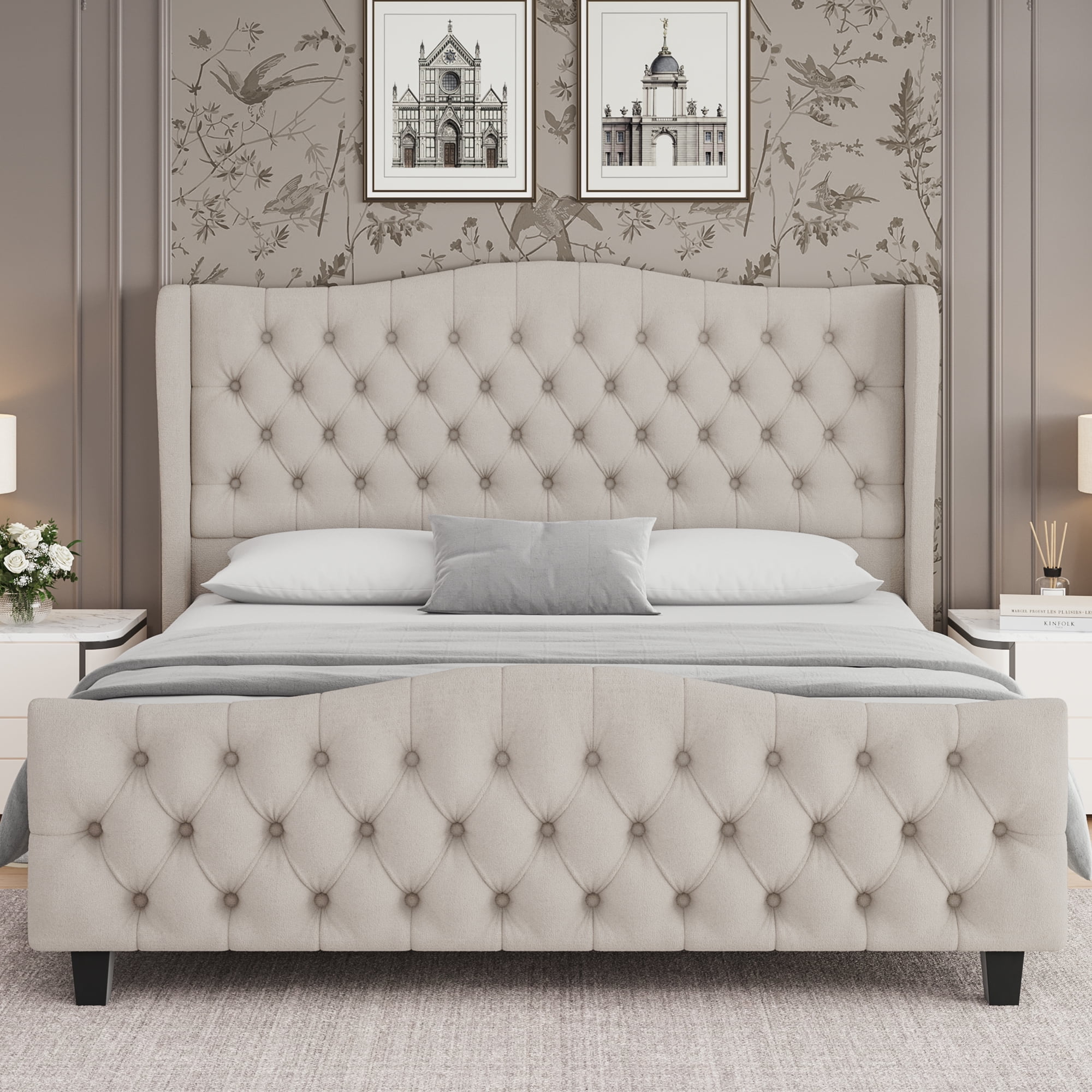 Homfa Queen Size Bed Frame with Tall Tufted Headboard 54.3 Tall Modern Velvet Upholstered Platform Bed Frame with Deep Button Wingback Headboard Very well made.