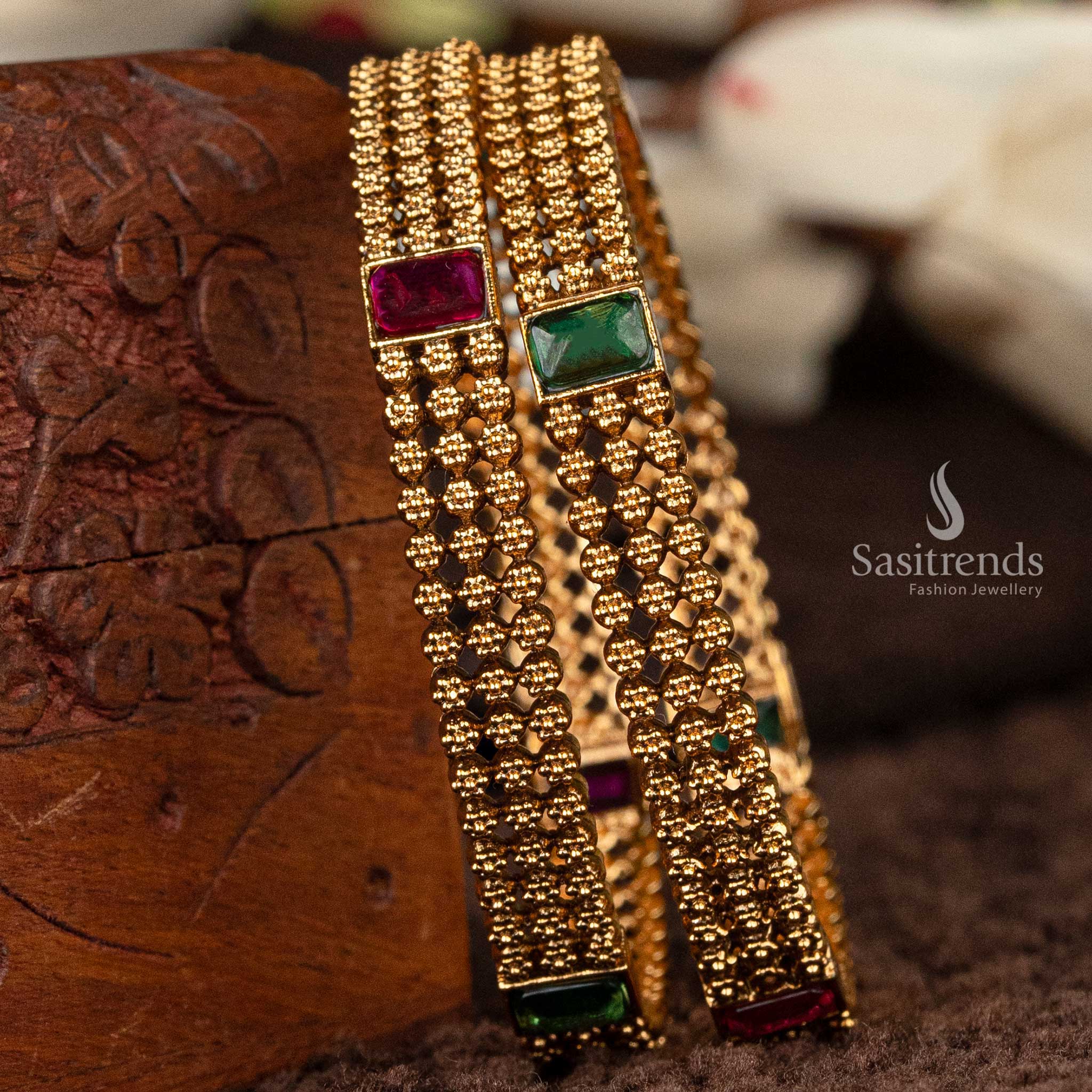 Elegant Premium Temple Matte Gold Bridal Wedding Bangles with Rectangular Stones in Ruby and Ruby Green Sasitrends Very well made.