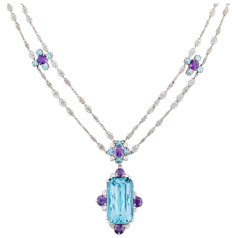 Tiffany Co. 12.00 Carat Aquamarine Amethysts Platinum Necklace Very well made.
