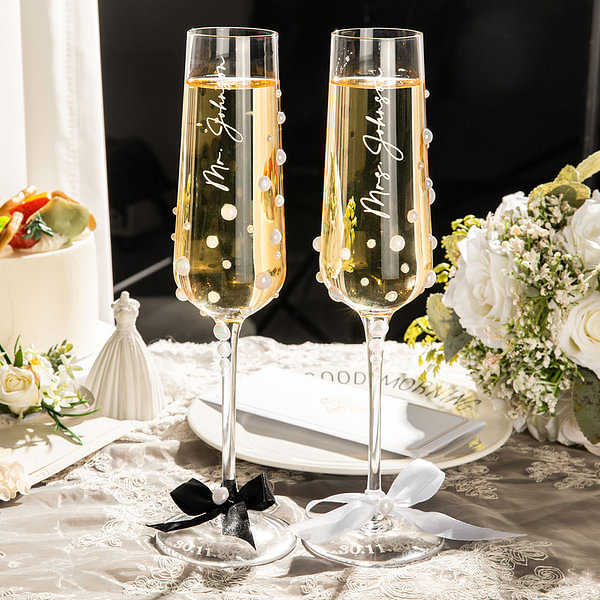 Personalized Set of 2 Engraved Wedding Crystal 7.5oz Champagne Flutes Adorned with Pearls and Ribbon Anniversary Wedding Gift for Newlyweds Couple CALLIE Very well made.
