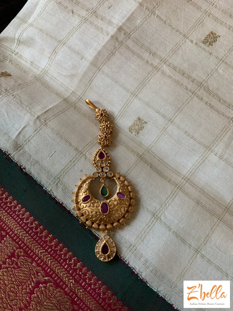 Tarinika Naishi Antique Maang Tika Antique Gold Finish with White Red variant Indian Jewelry Very well made.