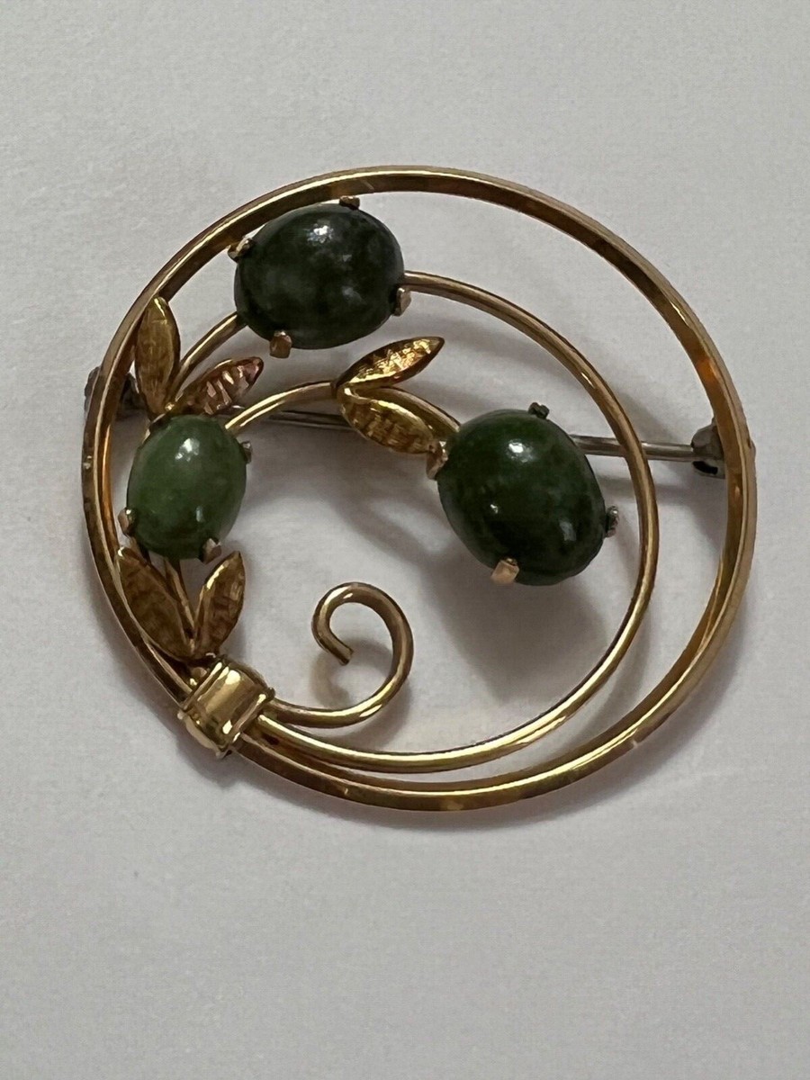 Vintage signierte Krementz Jade Jadeit goldfarbene Kreis Blatt Brosche Ansteckna Very well made.