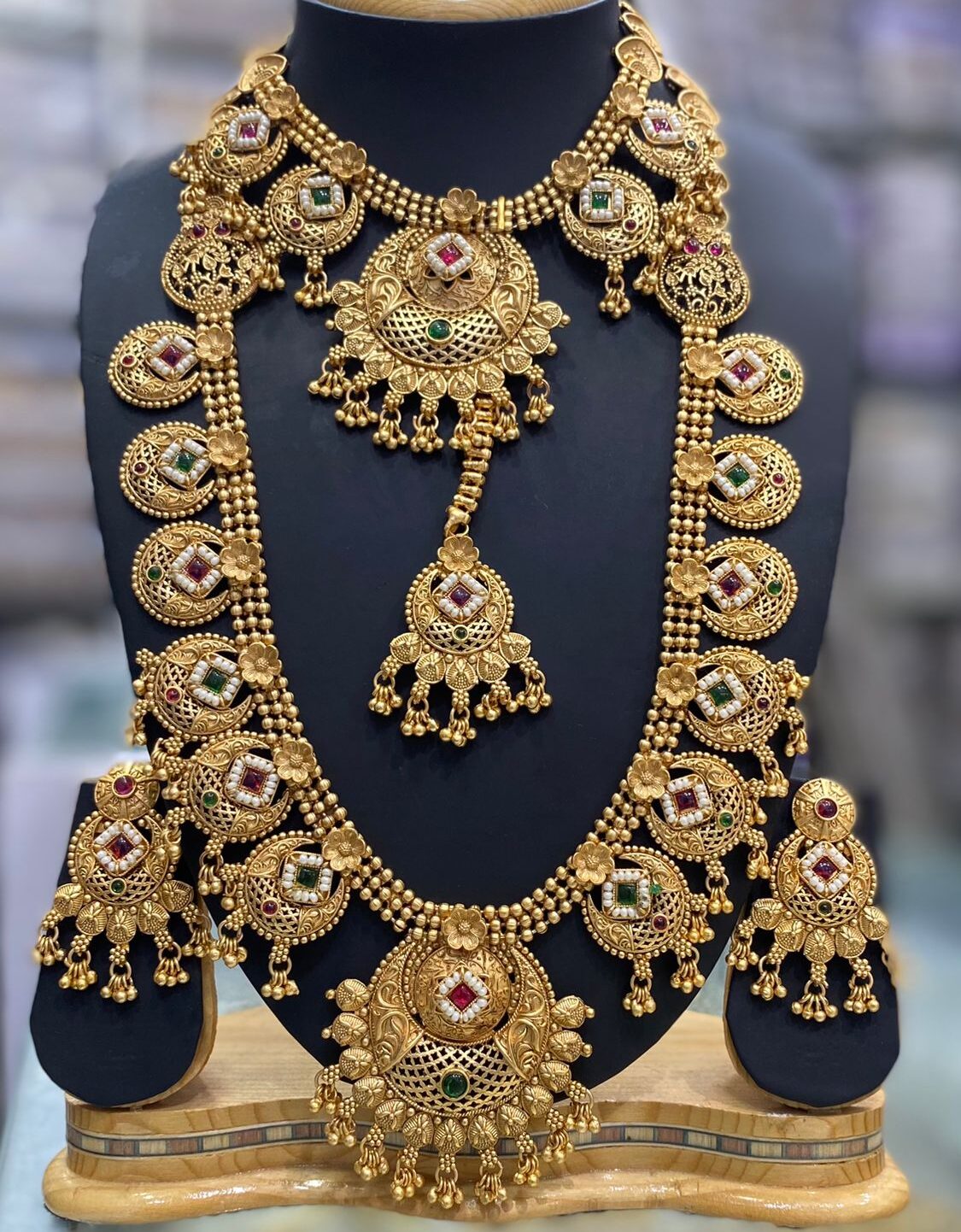 Matte finish jewellery set with price ruby stones Butta Model long necklace Swarnakshi Jewels Very well made.