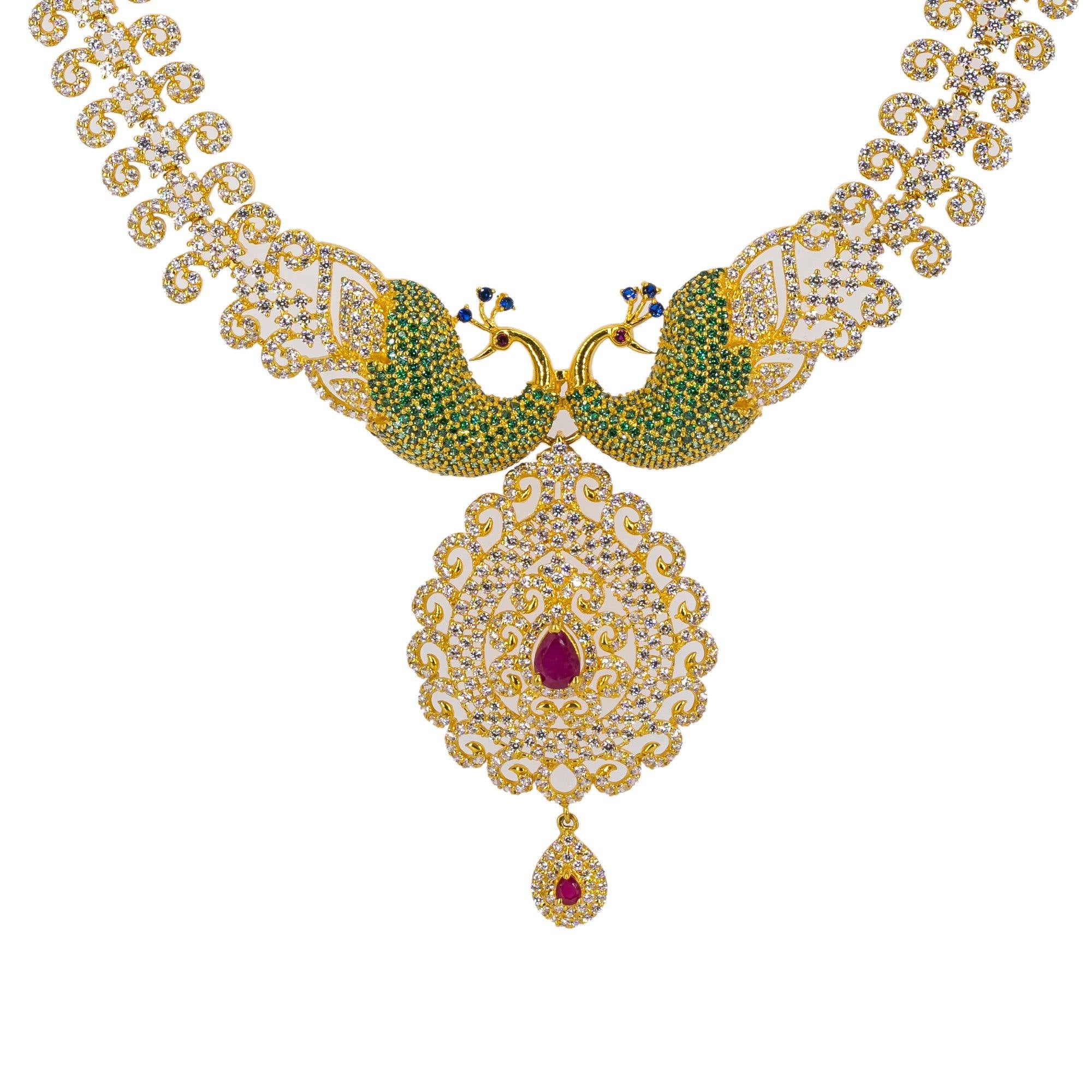 Virani Jewelers 22K Yellow Gold Long Necklace Earrings Set w Rubies Multi Colored CZ Encrusted Peacock Accents Very well made.