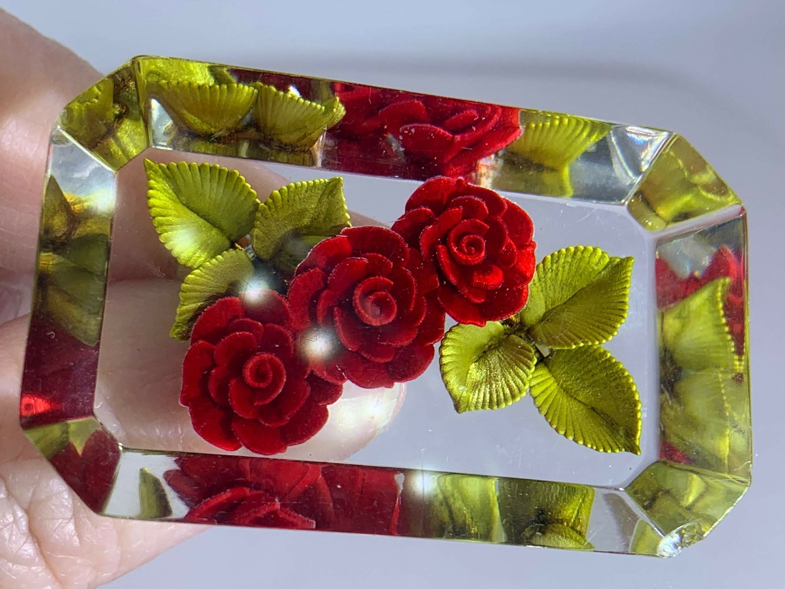 soldiersuzanne 1950s Clear Lucite Brooch Pin Reverse Carved Intaglio Teardrop w 3D Gold Red Flower Very well made.