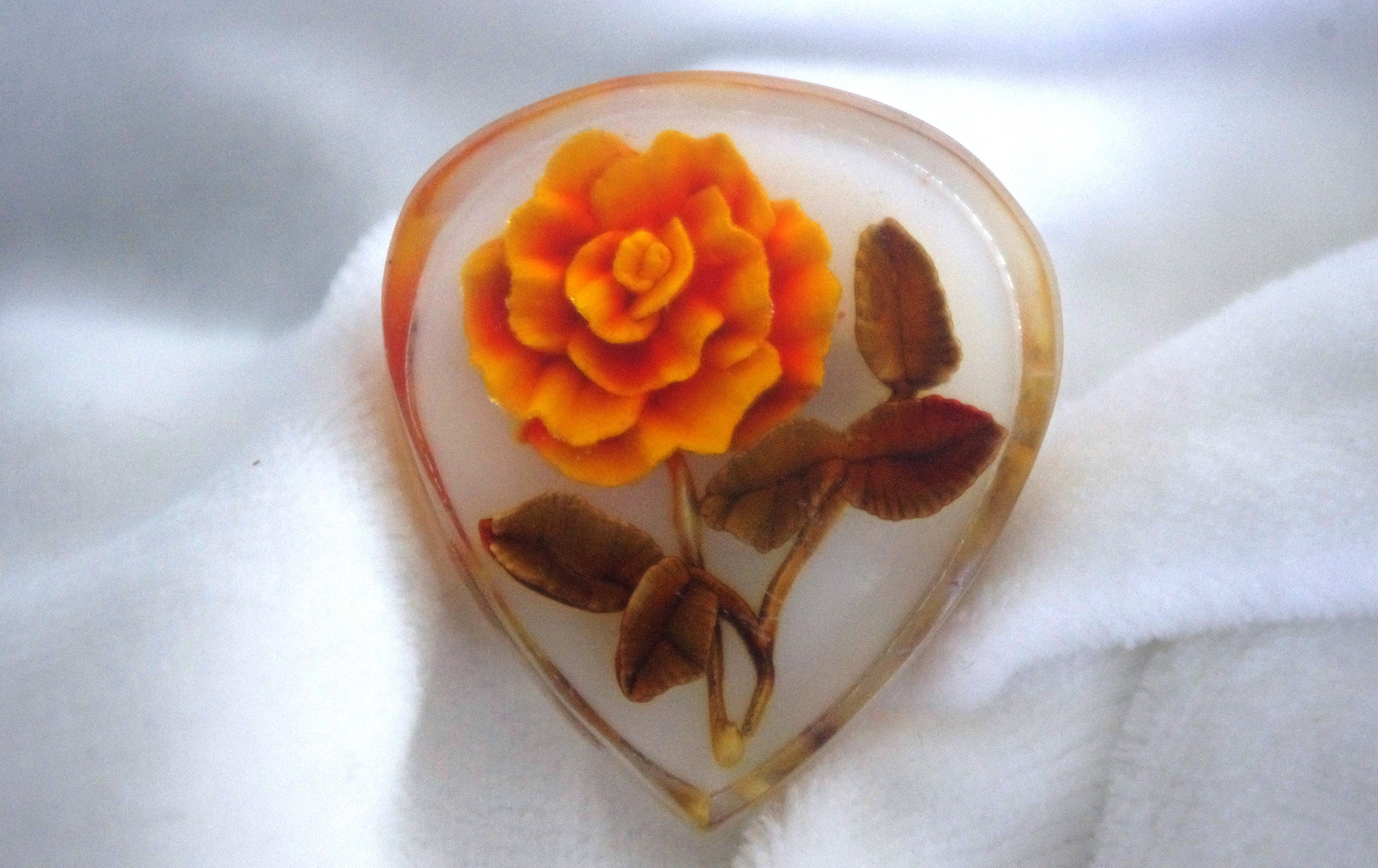 Flower Rose Hand Carved Gemtone 40s J W WOOD Vintage Lucite Pin Brooch V 5017 Very well made.
