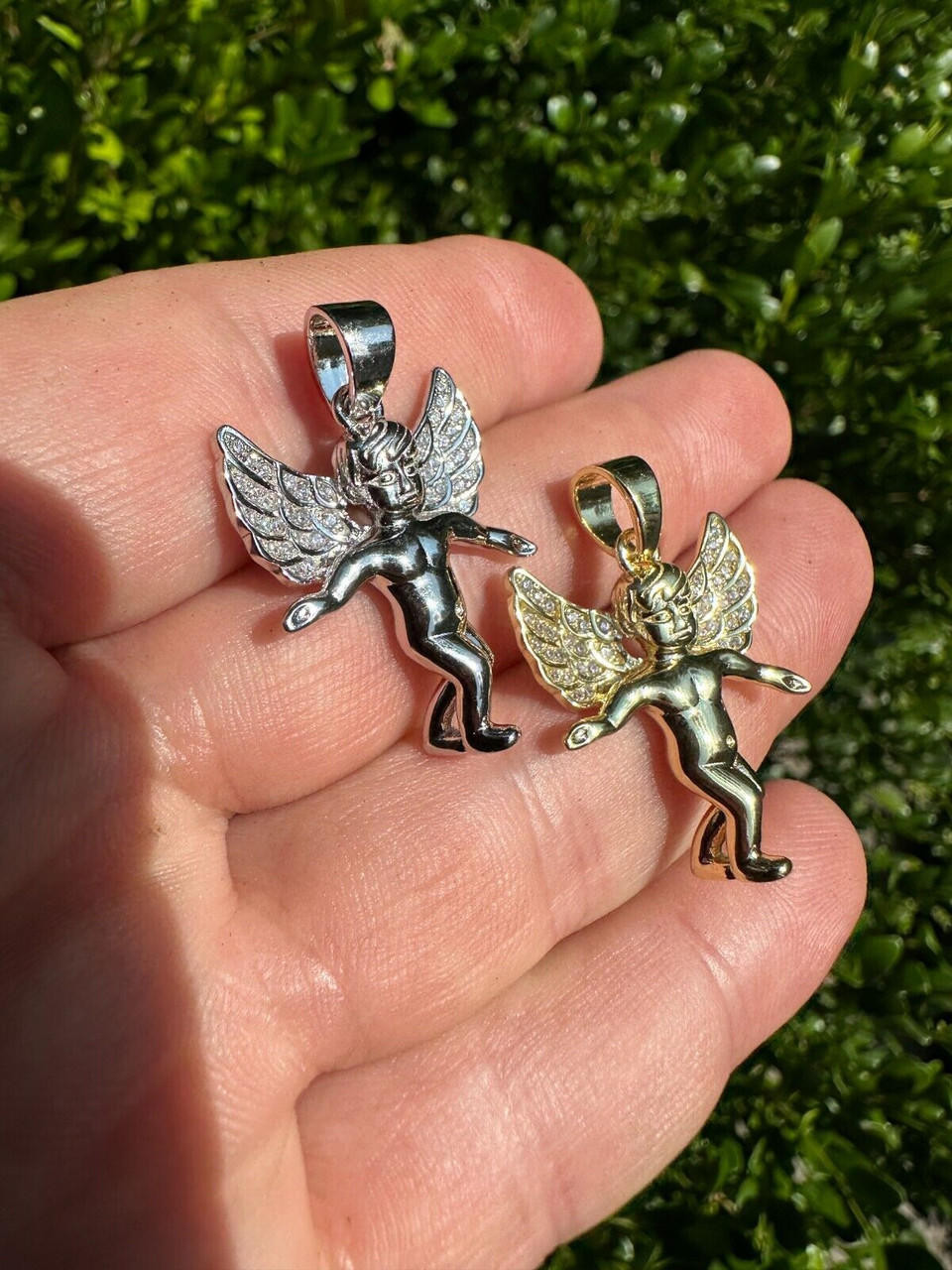 Micro Angel Pendant Iced CZ Solid 925 Silver Gold Plated Necklace Guardian Angel 14K Gold Very well made.