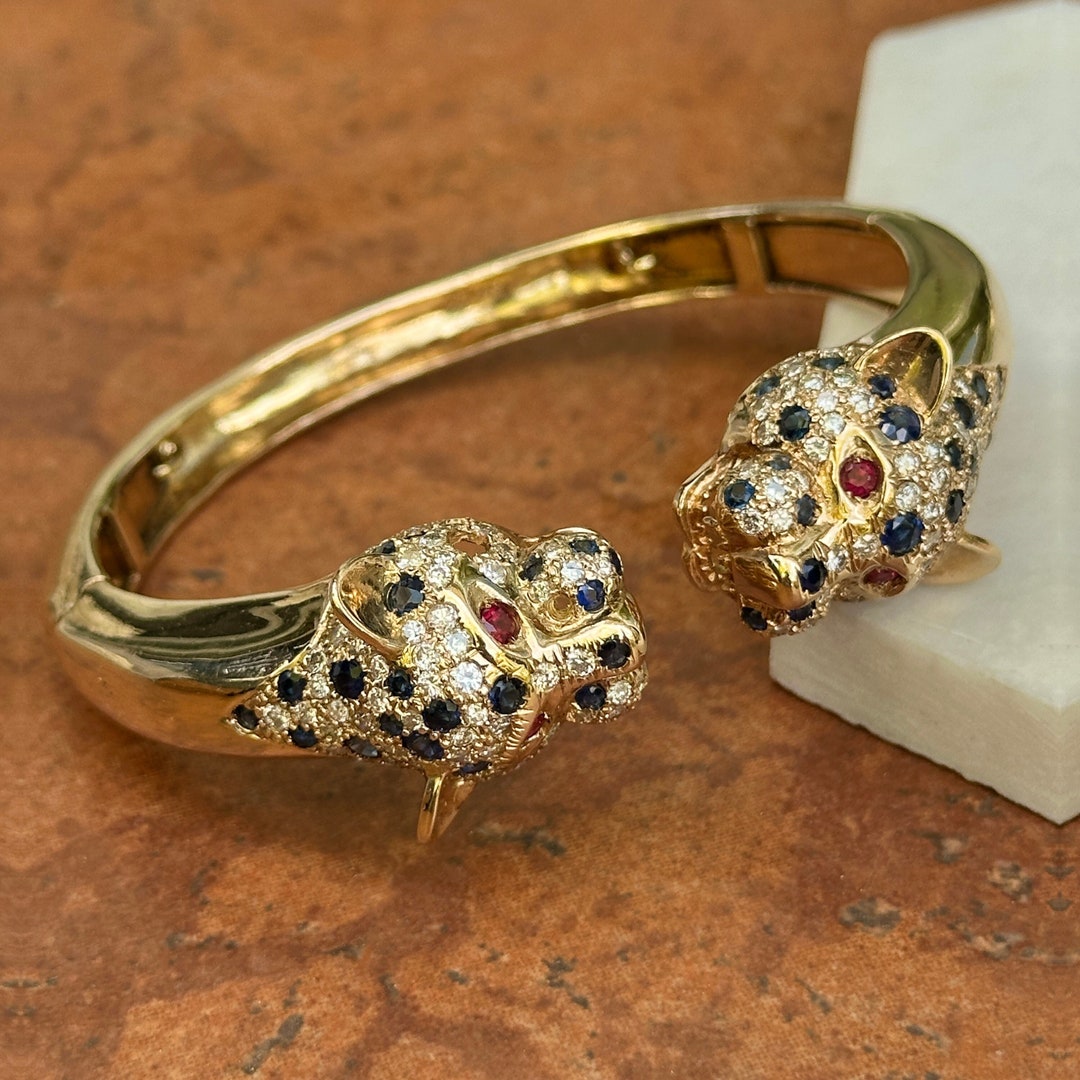 Vintage 14KT Yellow Gold Double Panther Head Pave Sapphire Ruby Diamond Eye Cuff Bangle Bracelet 2.46 Carats Etsy Very well made.