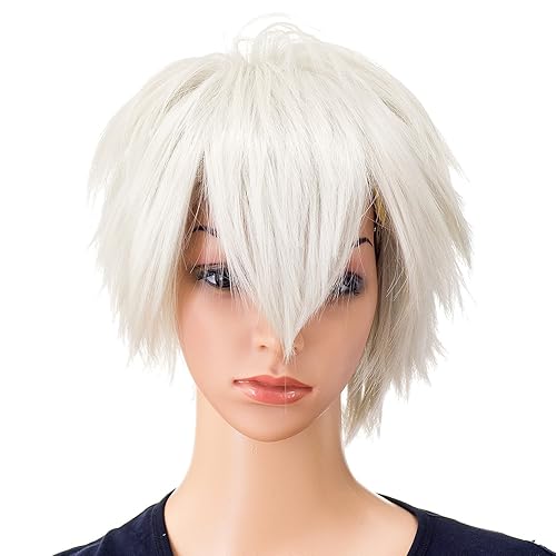 Synthetic Hair 12 Inch Short Silver White Fluffy Spiky Layered Straight Cosplay Wig Men s Wigs For Very well made.
