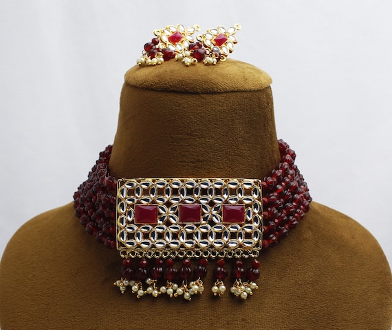 Indian Jewelry Kundan Choker Necklace Wedding Jewelry Indian Choker Indian Kundan Necklace Choker With Earrings Bridal Jewelry Maroon Choker Very well made.