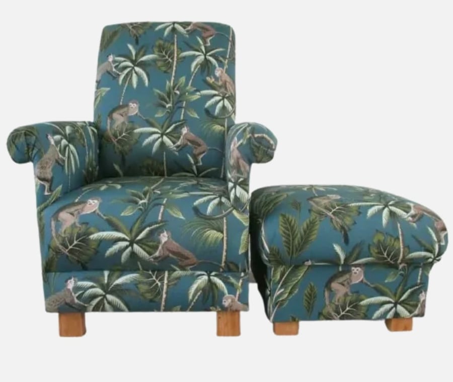 Monkey Teal Tropical Handmade Wingback Armchair Footstool Set Etsy Very well made.