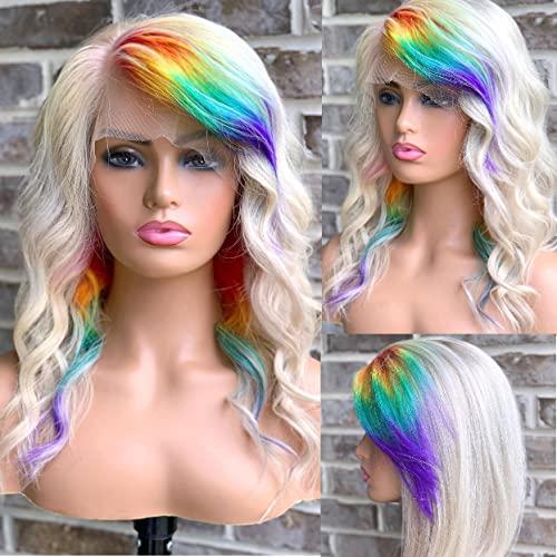 Haoke Highlight Wig Body Wave Lace Front Wig Rainbow Wig Ombre Colored Blonde Glueless Balayage Wig Brazilian Human Hair wigs for White Women 16inch Rainbow Blonde Very well made.