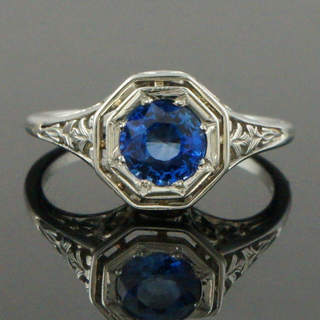 1920s Art Deco Solid 18K White Gold Filigree 1.0 Ct. Blue Sapphire E Olde Towne Jewelers Very well made.