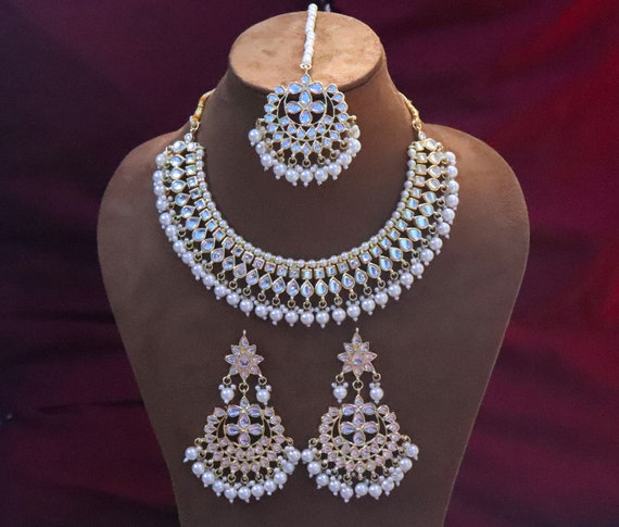 indiankundanjewelry White Pearls Necklace Earrings Tika Tikka Set Kundan Necklace Earrings Tika Set Gold Plated Jewelry Jewellery Bridal Engagement Jewelry Very well made.