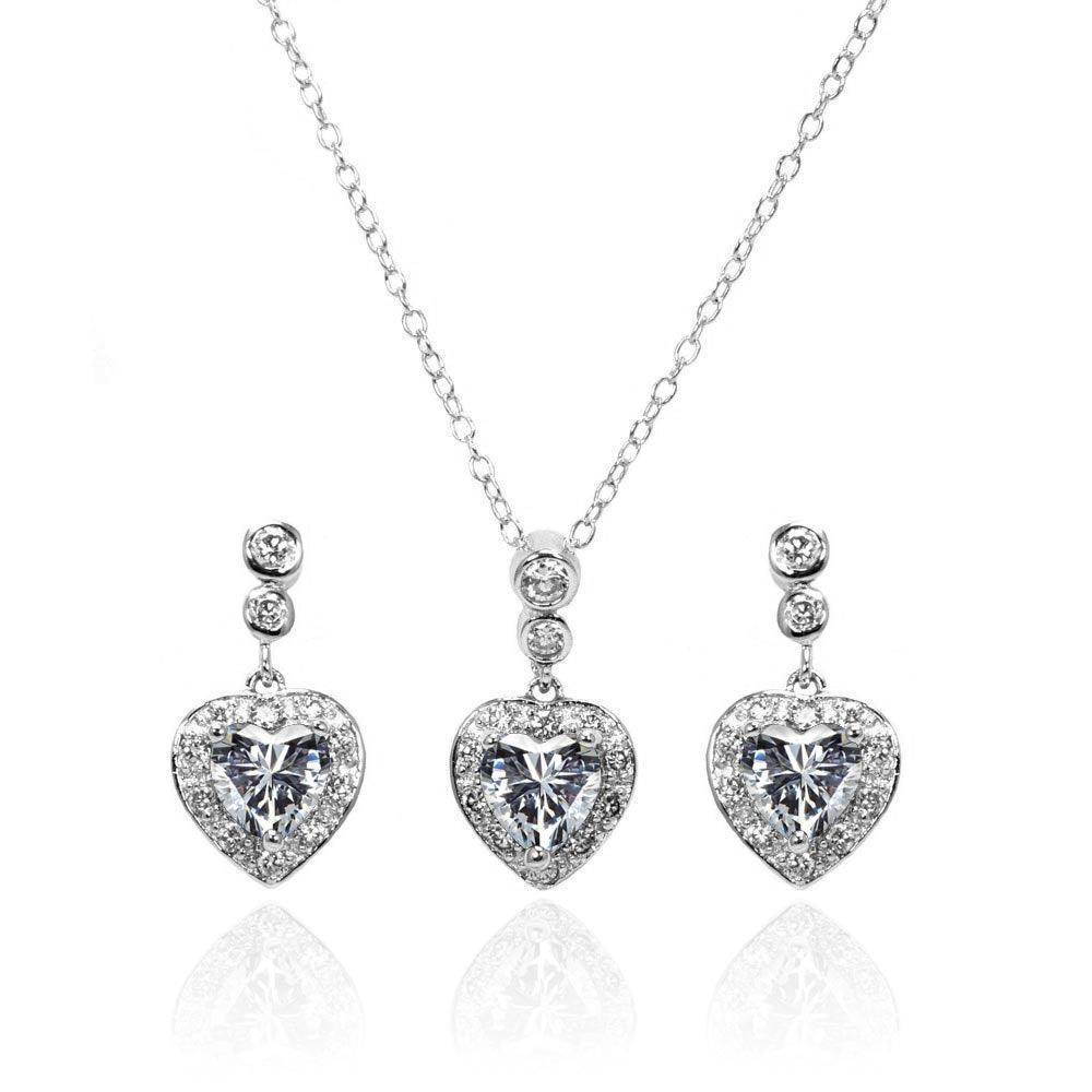 Silver 925 Rhodium Plated Clear Round and Heart Shaped CZ Dangling Stud Earring and Necklace Set BGS00368 Very well made.