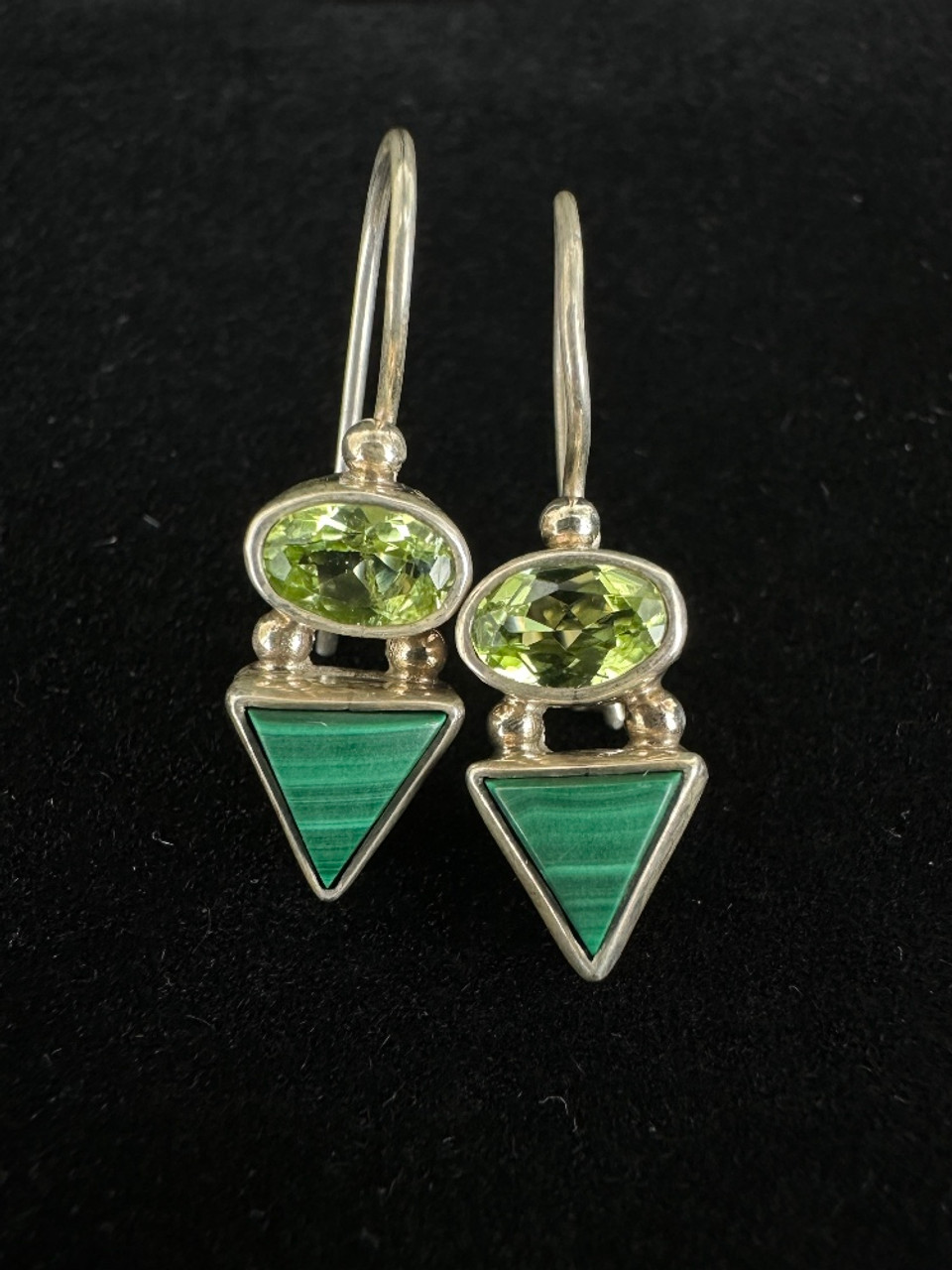 Vintage Sterling Silver Sajen Peridot Malachite Drop Earrings Ellis Antiques Very well made.