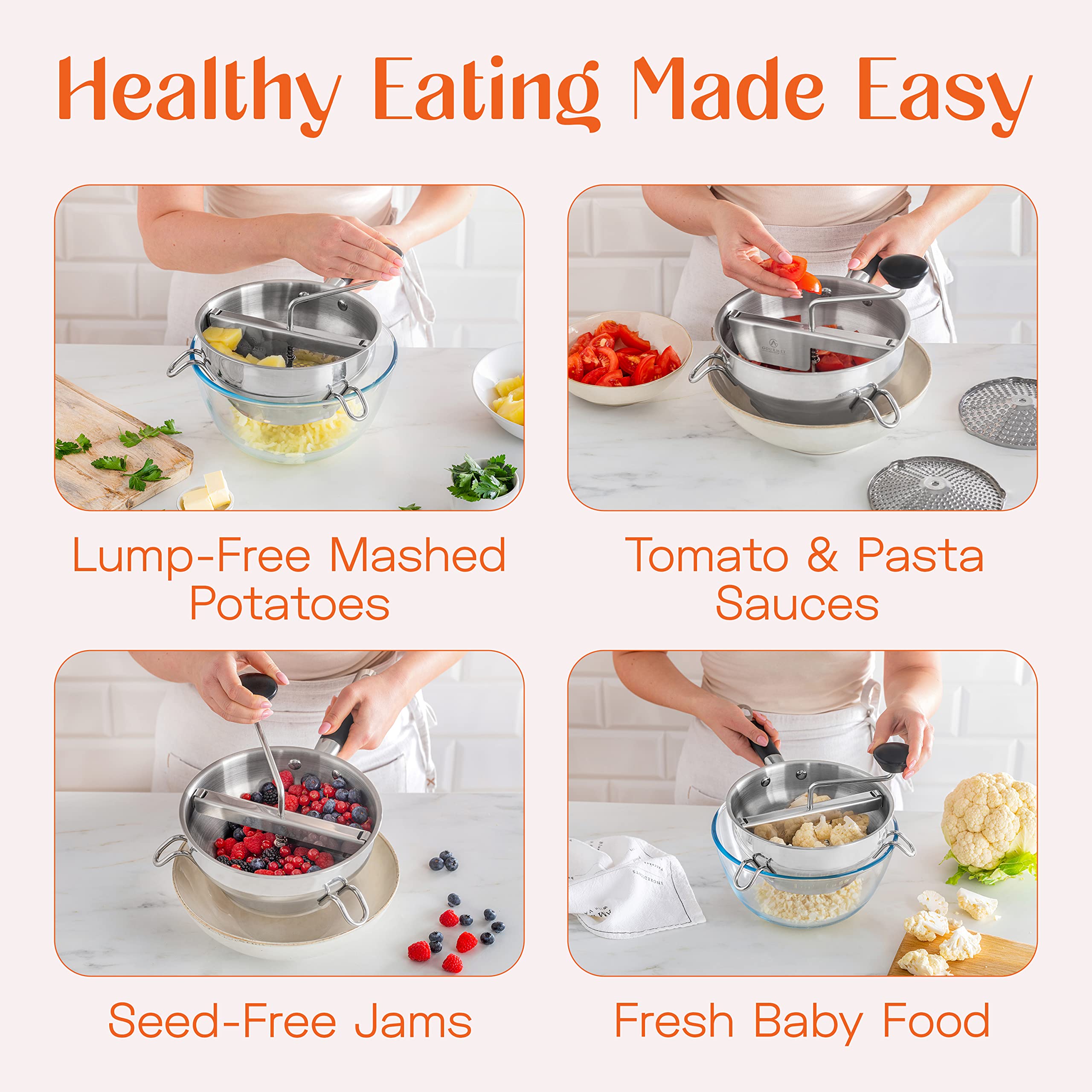 Food Mill Stainless Steel with 3 Discs Best Rotary Food Mills for Tomato Sauce Potatoes Baby Food or Canning Soft Silicone Handle and Dishwasher Very well made.