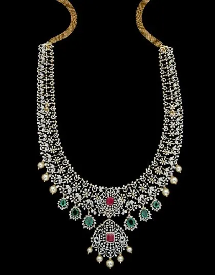 Shop Now Diamond Long Necklace For A Royal Look Krishna Jewellers Pearls and Gems Very well made.