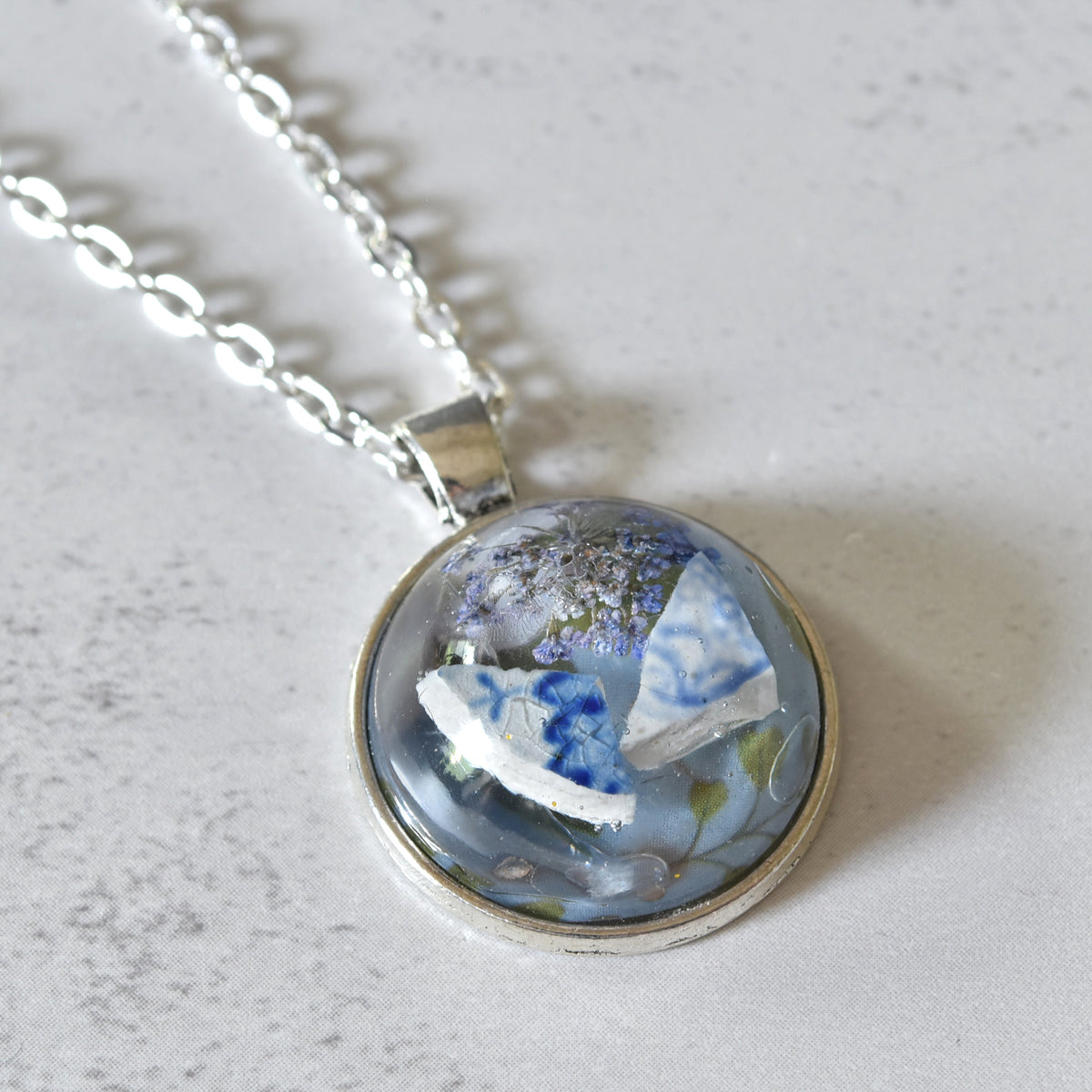 Plate Shard and Dried Flower Resin Necklace Blue Very well made.