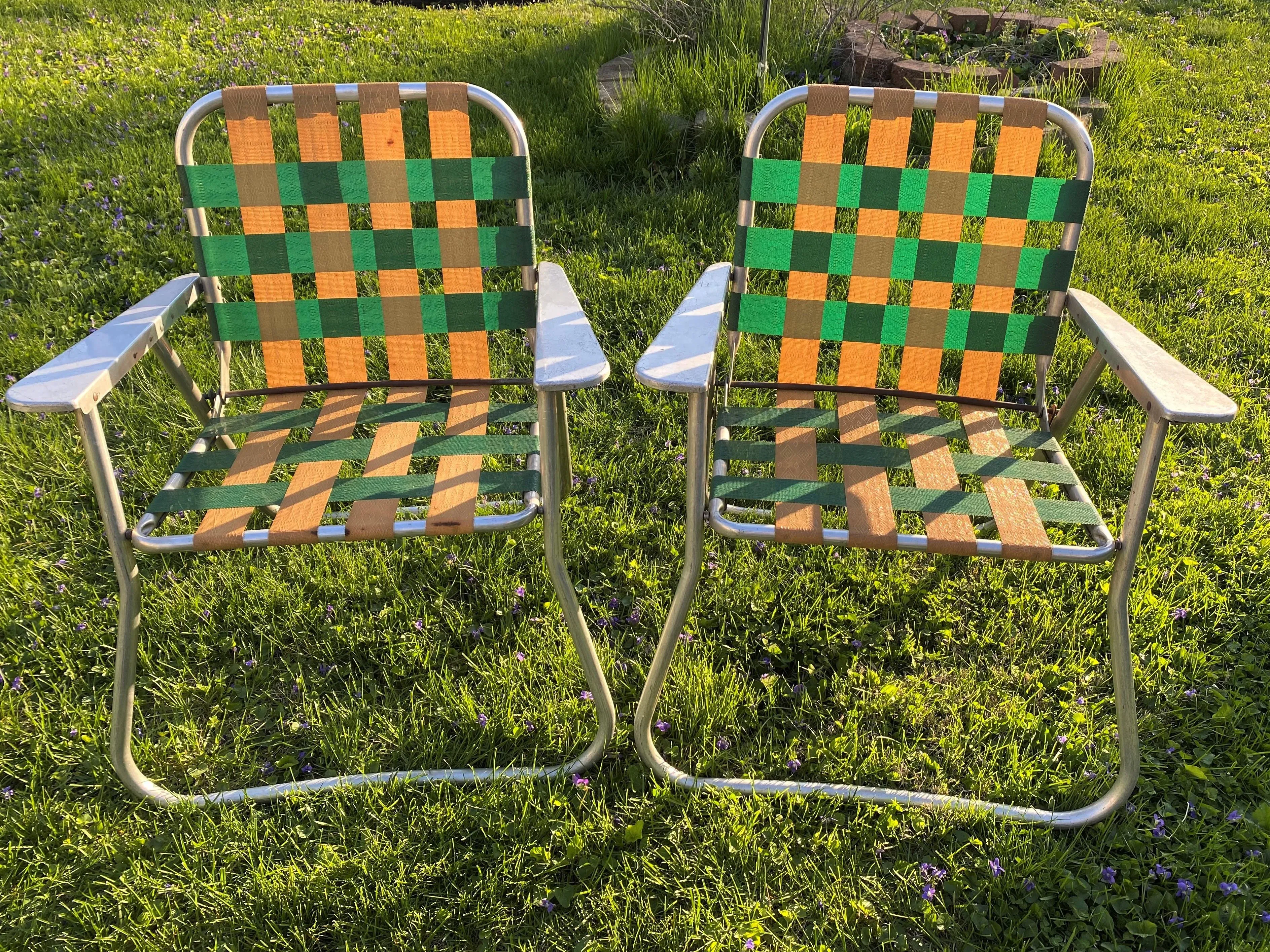 2 Vintage Mid Century Woven Macrame Aluminum Folding Lawn Chair Patio Furniture Very well made.