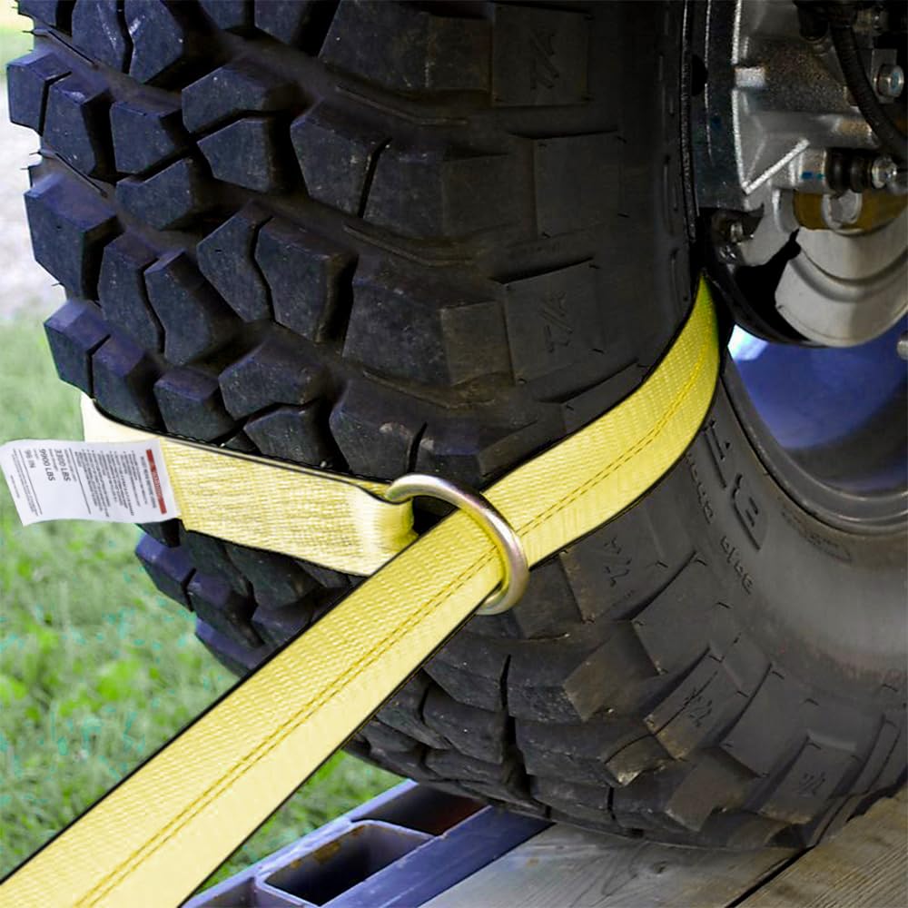 4 Pack Heavy Duty Tire Straps for Car Trailer 2 x 96 3 300 lbs Safe Working Load Wheel Straps for Hauling Cars Ideal for Securely Transporting Vehicles Yellow Towing Straps Very well made.