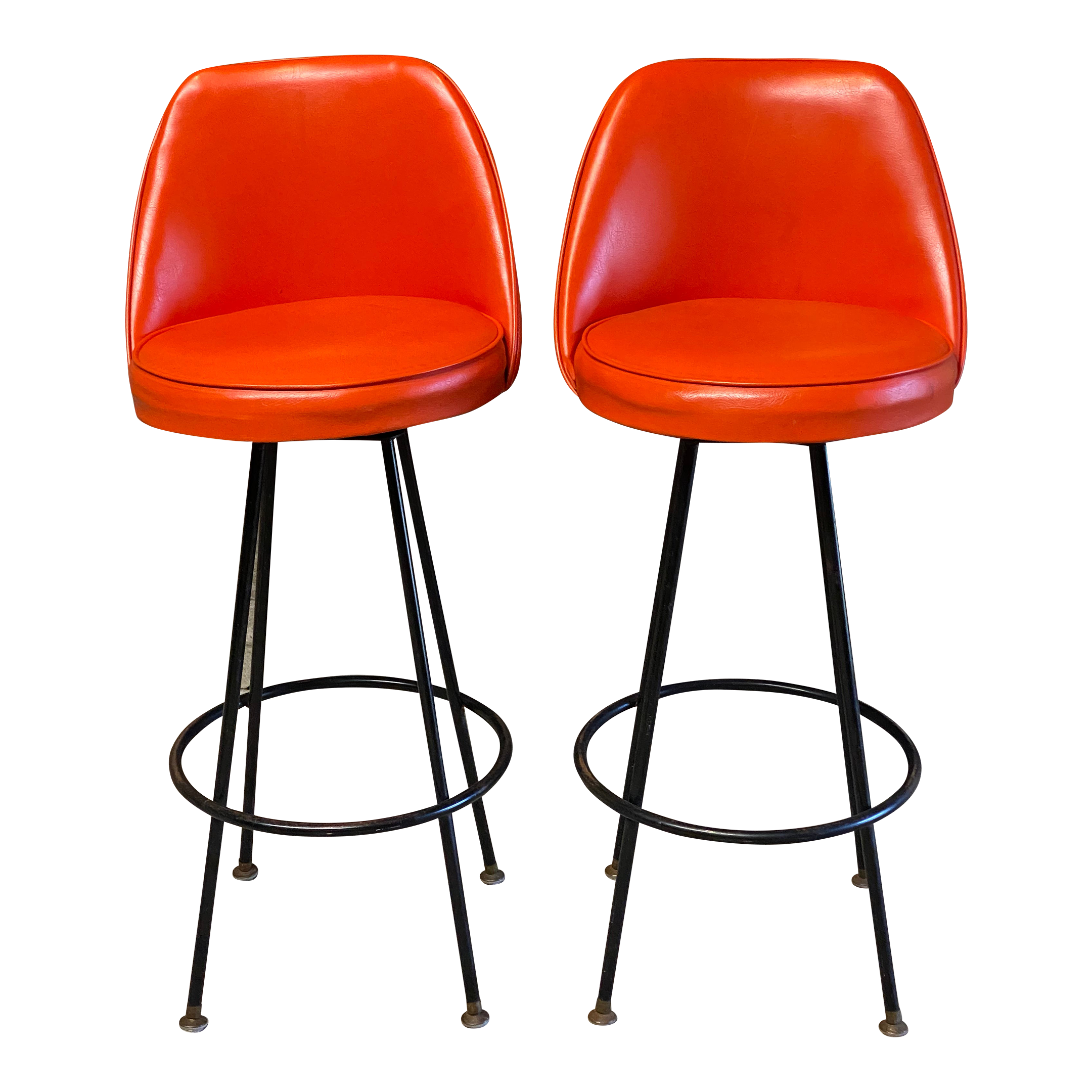 Brilliant 1960s Orange Vinyl High Back Swivel Bar Stools Very well made.