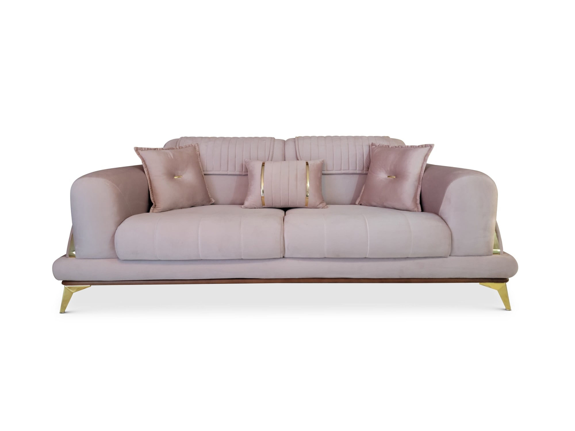 Un illet 87 Round Arm Sofa Light Rose Velvet Upholstery Wood Trim Golden Metal Legs Very well made.