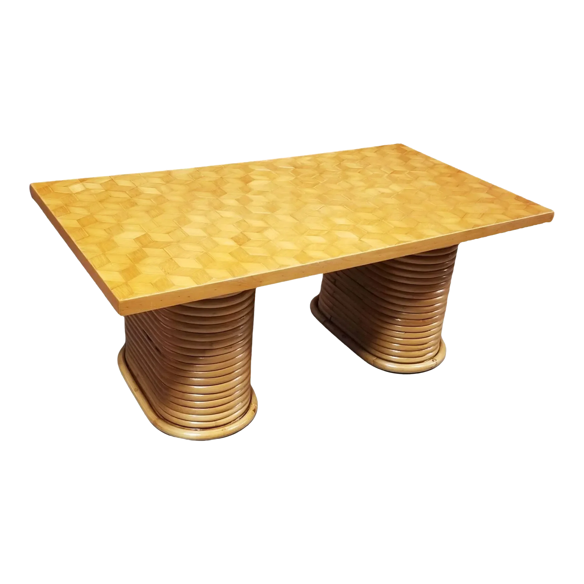 1950s Restored Rattan Cube Pattern Coffee Table Top With Stacked Pedestal Legs Very well made.
