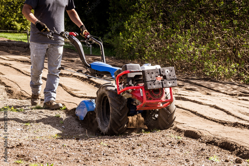 rototiller tractor unit preparing soil dirt on outdoor garden Very well made.