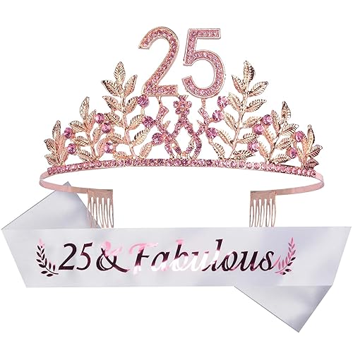 25th Birthday Sash and Tiara for Women Fabulous Set Glitter Sash Leafs Rhinestone Pink Premium Metal Tiara for Women 25th Birthday Gifts for 25th Birthday Party in Oman Whizz Party Packs Very well made.