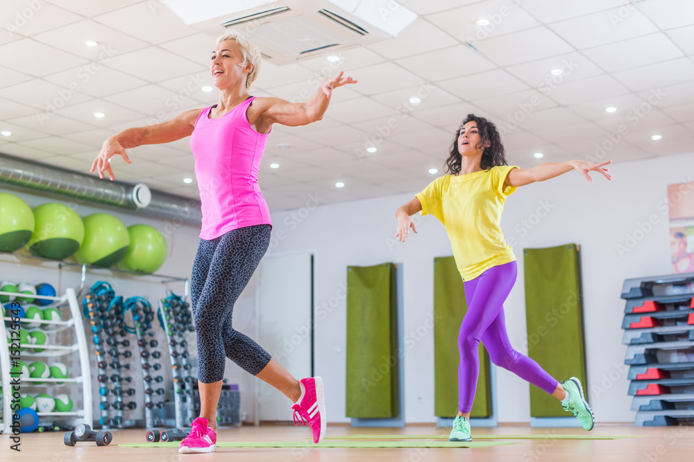 Sporty ladies doing aerobic dance exercises. Two female athletes Very well made.
