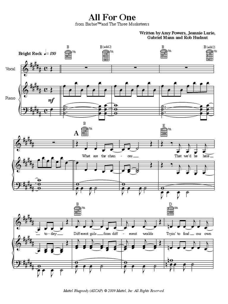 Barbie All For One Sheet Music PDF Poupees de mode Mannequins Very well made.