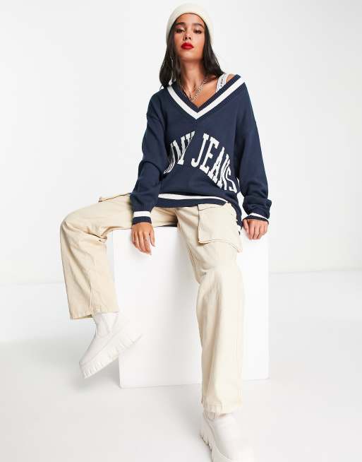 Tommy Jeans x ASOS exclusive varsity logo v neck sweater in navy Very well made.