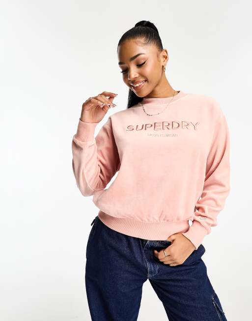 Superdry Sweat coupe carr e en velours avec motif graphique et col ras de cou P che beige Very well made.