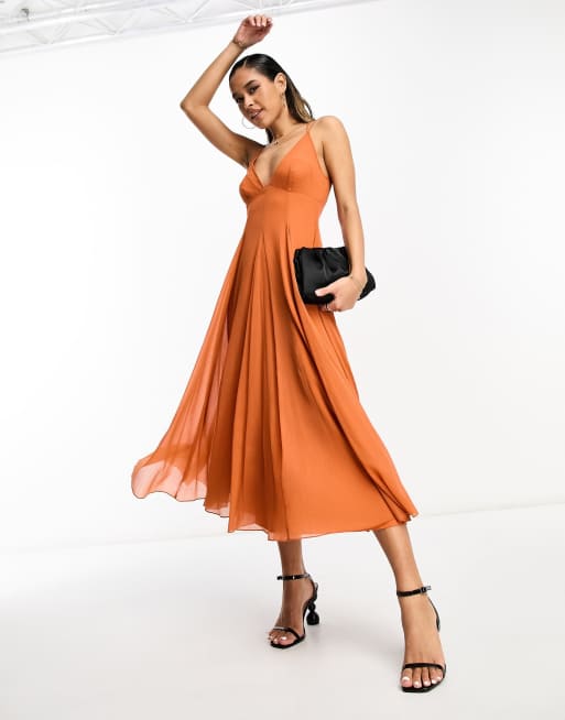 ASOS DESIGN Robe caraco patineuse mi longue bretelles fines et godets Rouille Very well made.