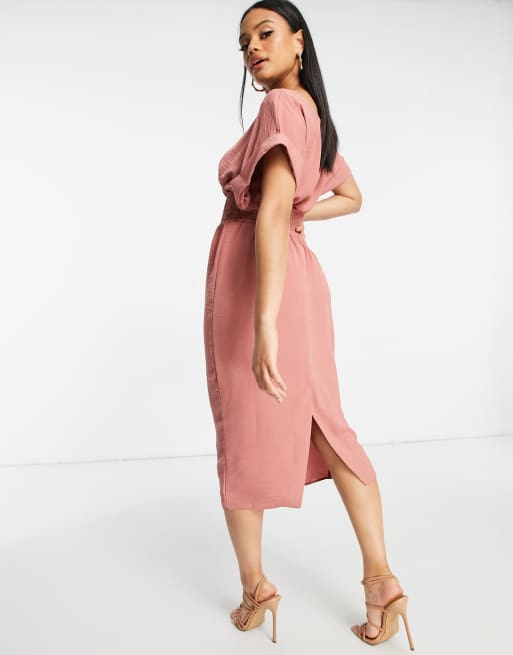 ASOS DESIGN shirred waist midi dress with fallen shoulder in rose Very well made.