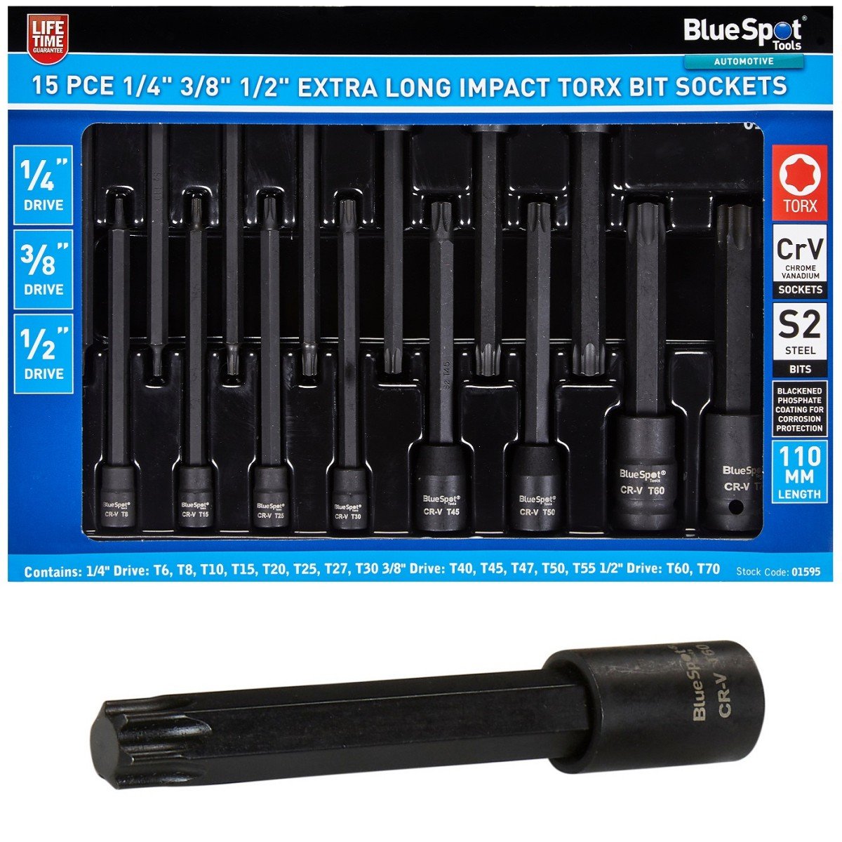 Blue Spot Tools 1 4 3 8 1 2 inch Extra Long Impact Torx Bit Socket 15pc Set 01595 Bluespot Sealants and Tools Direct Very well made.